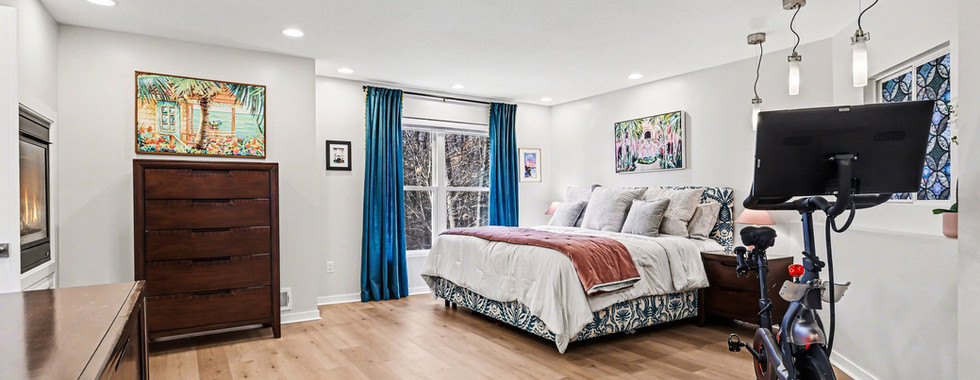 Owner’s Suitet: Spacious bedroom with a unique two-way fireplace visible from both the bedroom and the jetted tub, huge double tiled shower with glass block window, and generous walk-in closet.